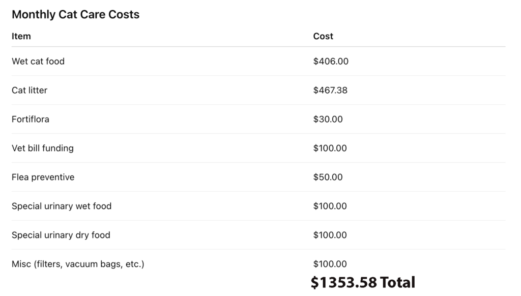 - $406.00 in wet cat food (8 cans of regular, 2 cans of farm fresh and 2 sheba daily)